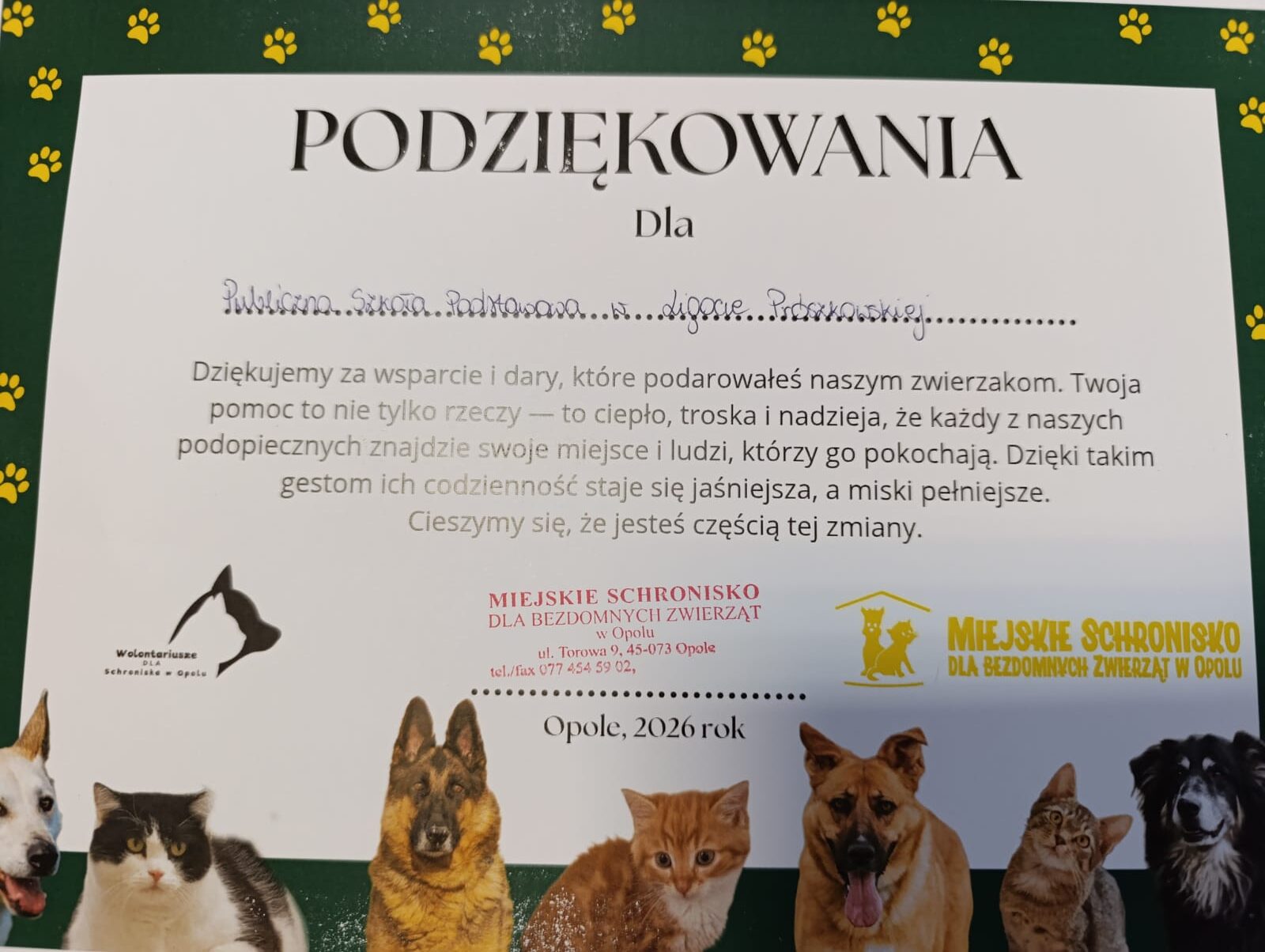 W naszej szkole odbyła się zbiórka karmy oraz artykułów dla zwierząt ze schroniska w Opolu. Uczniowie z dużym zaangażowaniem przynosili karmę mokrą i suchą dla psów i kotów, przysmaki, koce, ręczniki, zabawki, piłeczki, gryzaki oraz żwirek dla kotów. Dzieci chętnie