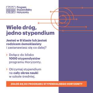 Uczniów i uczennice z małych miejscowości, którzy kończą szkołę podstawową i chcą rozpocząć naukę w najlepszych liceach i technikach w dużych miastach, zapraszamy do zgłaszania się do Stypendium Horyzonty.  W ramach stypendium uczniowie otrzymują wsparcie finansowe przez całą szkołę średnią w postaci: