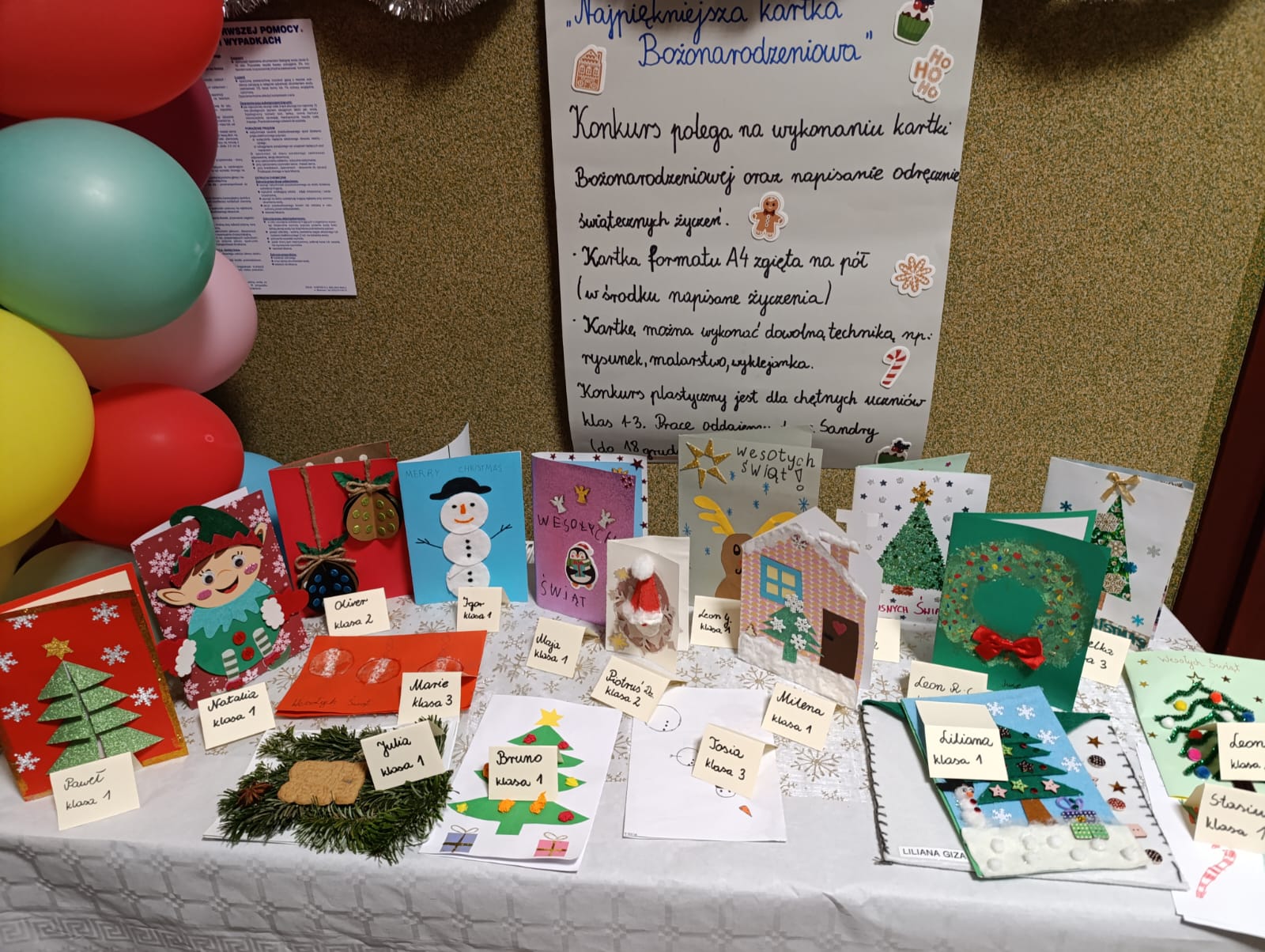 Wyróżnienia otrzymali: Natalia Dziony (klasa I), Julia Kania (klasa I) oraz Paweł Przybyła (klasa I).Wszystkie prace zachwycały estetyką i pomysłowością. Konkurs był doskonałą okazją do rozwijania zdolności artystycznych uczniów oraz kultywowania tradycji bożonarodzeniowych. Gratulujemy zwycięzcom i dziękujemy wszystkim uczestnikom za udział. Zachęcamy do udziału w kolejnych konkursach organizowanych w naszej szkole.